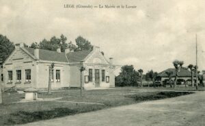 Avant l’apparition de l’eau courante, la lessive se fait à la main, et le rinçage du linge, nécessitant de grandes quantités d’eau claire, s’effectue à la rivière ou à la fontaine. Ce n’est qu’au 19ème siècle que la pureté de l’eau devient un enjeu primordial pour la salubrité publique, suite aux épidémies de choléra, de variole et de typhoïde engendrées par l’eau souillée. Les lavoirs prennent leur essor à cette époque, assurant hygiène et propreté à leurs utilisateurs. Situé à côté de l’ancienne mairie, le lavoir dit de la Mairie est construit en 1906, à proximité du puits artésien. L’entreprise Billiot et Gaden, constructeur du puits, est également engagée pour la construction du lavoir. Le lavoir est en ciment armé, d’une longueur de 6 mètres, partagé en deux bassins, et pourvu de 4 bancs de lavage. En octobre 1907, le Conseil Municipal juge urgente la construction d’un hangar-abri pour le lavoir. Il charge François-Osmin Gayet, entrepreneur à Lège, des travaux de couverture. Le lavoir semble avoir disparu lors de la construction du collège dans les années 1980.