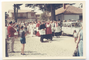 Cap Ferret – Monseigneur Richaud lors de la bénédiction de Notre-Dame-des-Flots en 1966 (fonds secteur pastoral/Jacques Lavie, Archives municipales de Lège-Cap Ferret)
